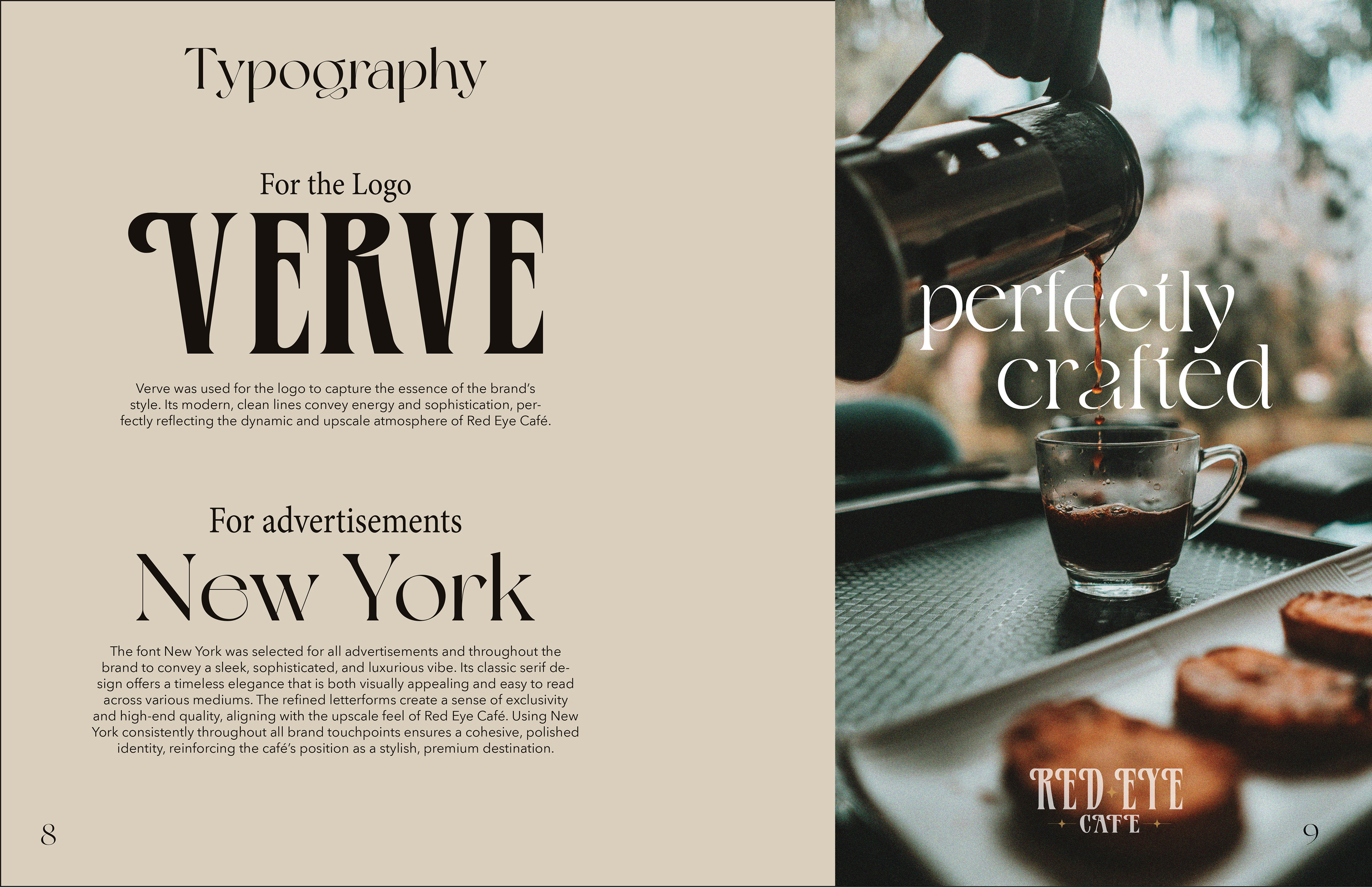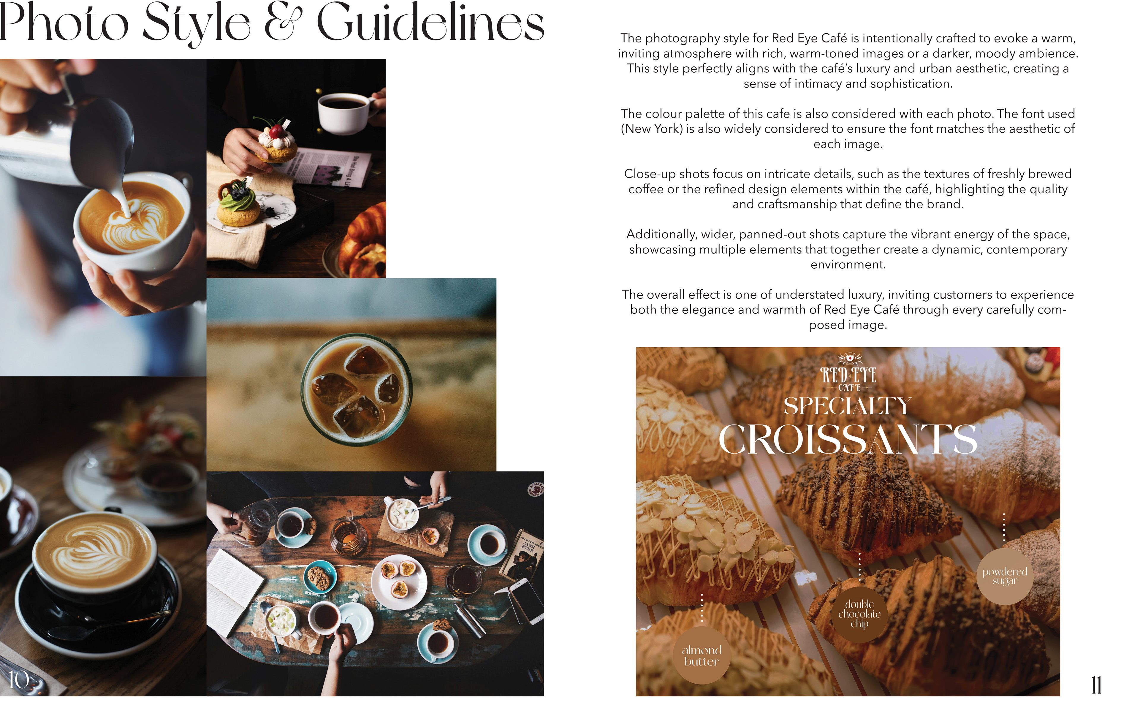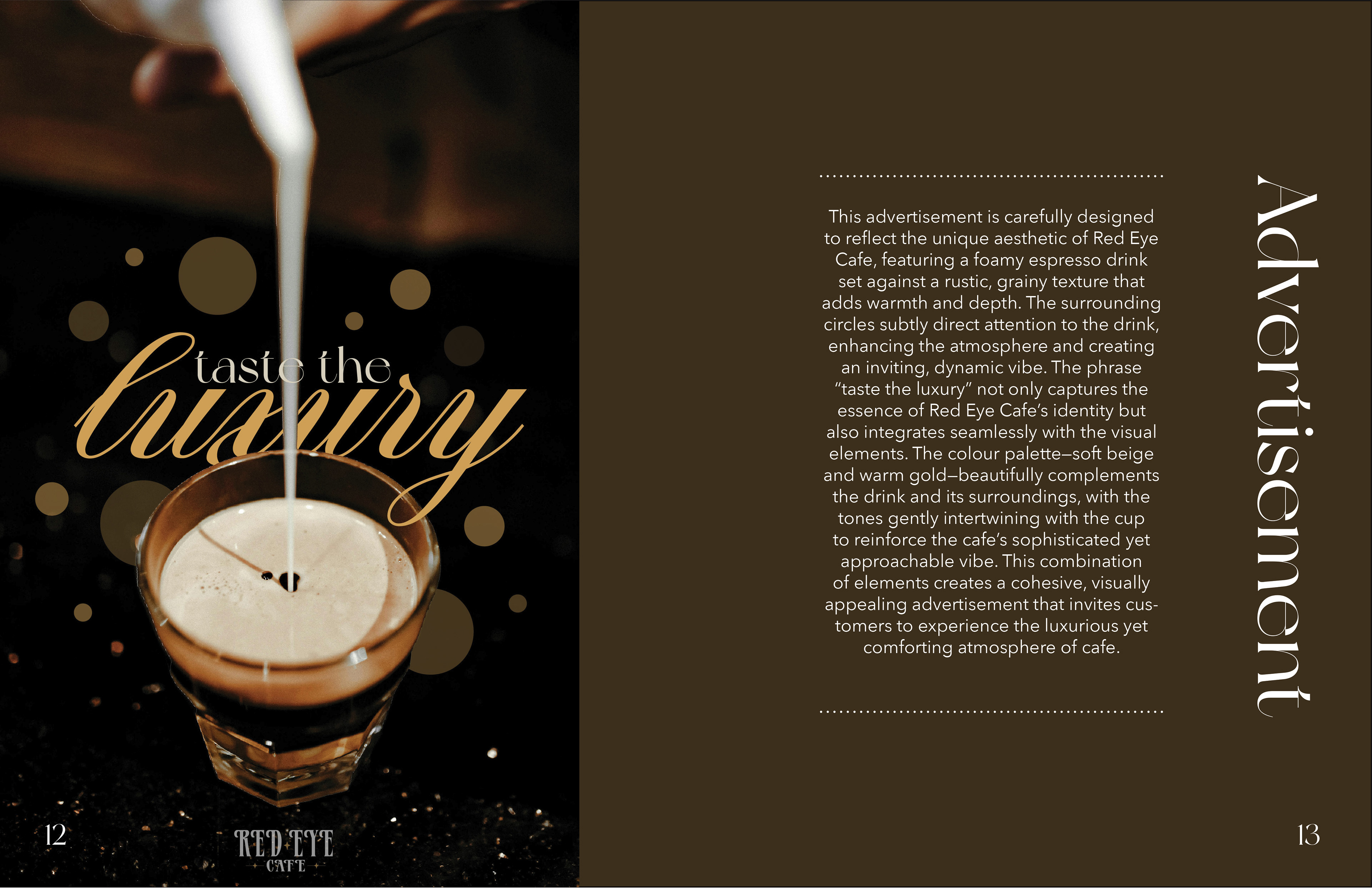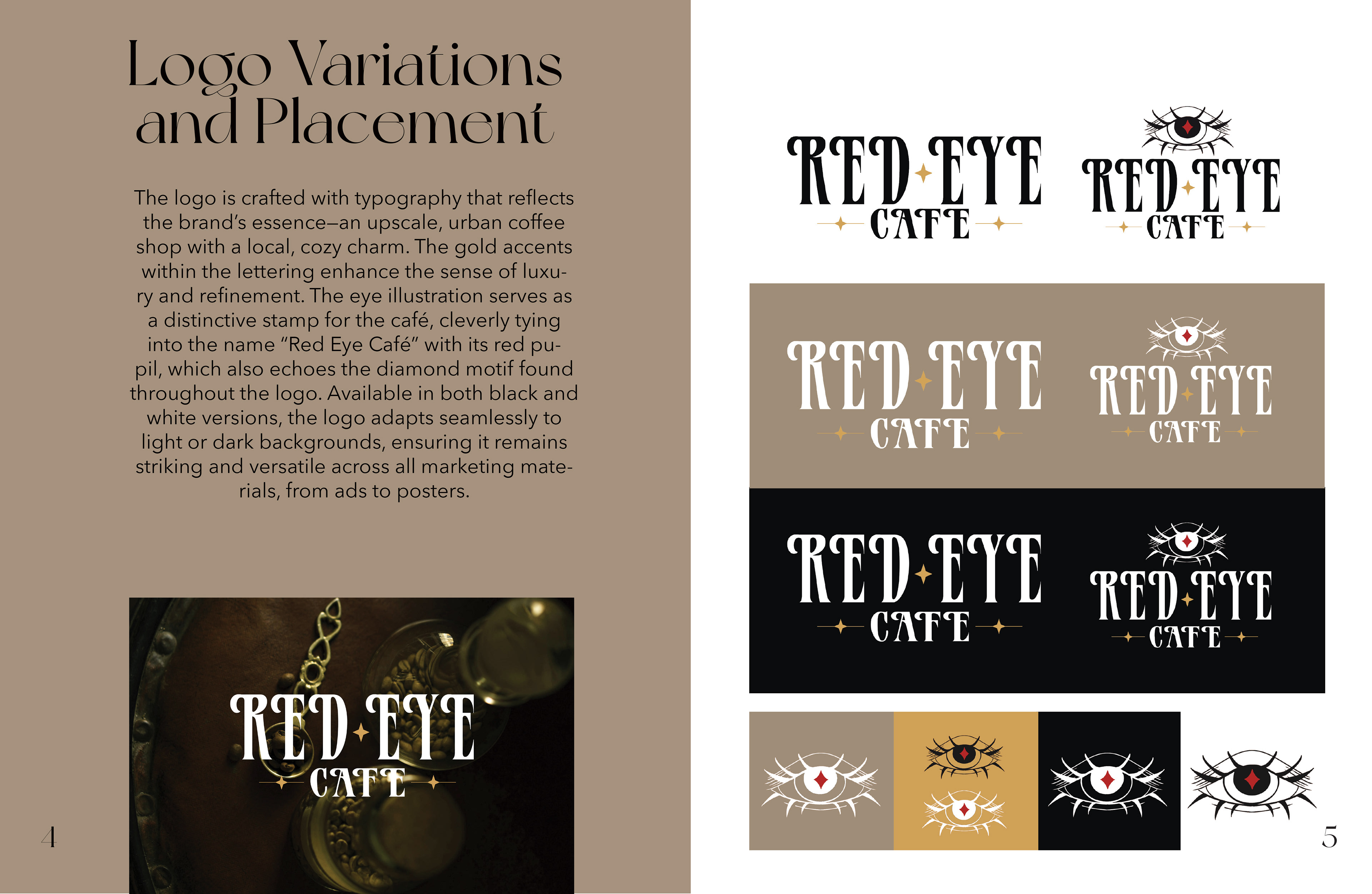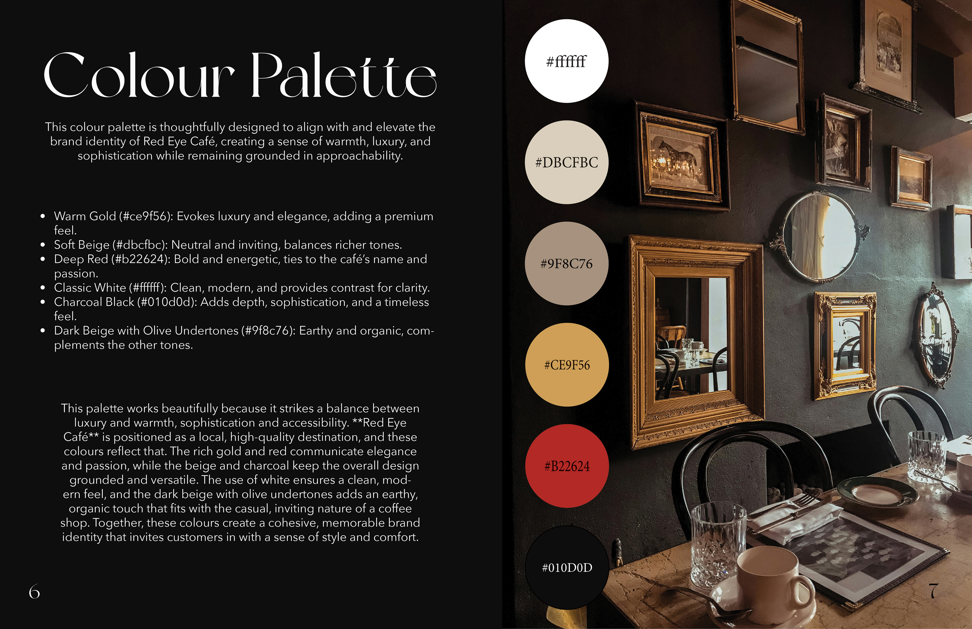 The brand identity for Red Eye Cafe, a luxury coffee brand, was developed through the design of logos, selection of a sophisticated colour palette, and creation of a style guide to ensure a unified and polished visual presence across all touch points.